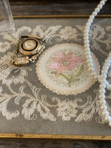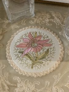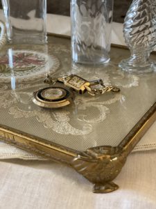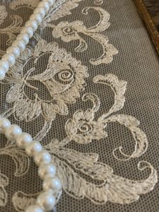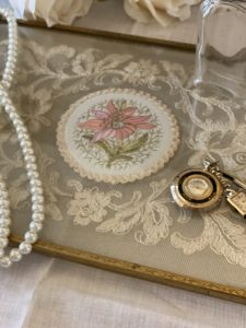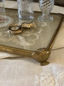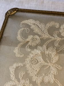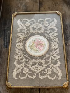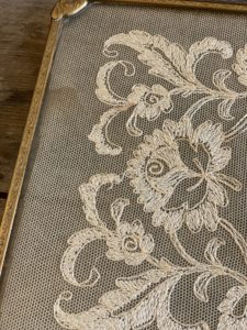 The lace is of an intrinsic & delicate design with a stunning petit point embroidered floral centrepiece. The gold toned metal framework holds the glass perfectly in place & is finished off with 4 ornate detailed feet.