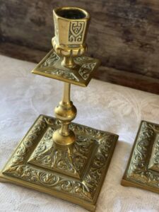 This magnificent pair have delightful a repeating scroll & vines pattern throughout, covering the stand base, upper square drip platform and the candle cup.
