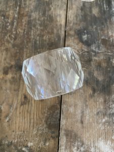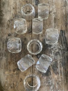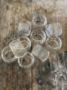 The set consists of 10 cut glass , diamond designed rings. The diamond pattern covers the entire napkin ring which allows them to catch the light and reflect colours beautifully.