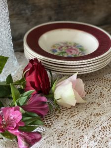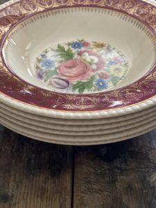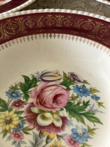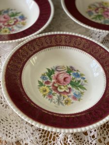 The design consists of a elegant & attractive floral design in beautiful range of colours, a thick burgundy band finished off with a superb gold filigree decoration which also drops down slightly into the recess of the bowls. The edges of the bowls are scalloped in a subtle cream colour.
