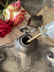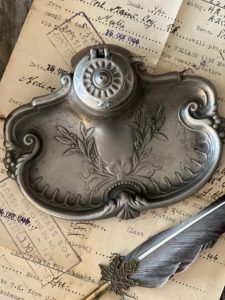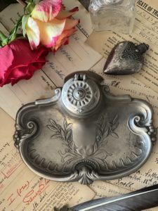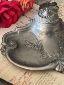 The inkwell has a lovely curved edge with a pretty floral design & bow. It still has its original ink pot that has a piece cut out of the rim allowing the pot to sit neatly and the lid to shut properly.
