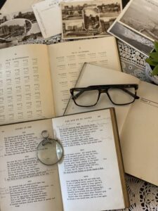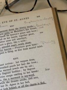 “Keats Poetry & Prose” 1924 has been a very well used book and clearly has been used to aid someone’s study. There are numerous written notes ( in pencil) and underlining of certain parts of the text, plus personal reference notes at the back of the book. I have not rubbed these out as they are quite fascinating to read & to see how someone deciphered the meanings of the poems etc.