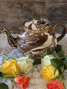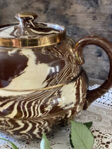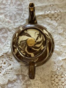 The pot has a wonderful brown base glaze with a stylish cream / white marbled effect design swirling around the sides, spout & lid.