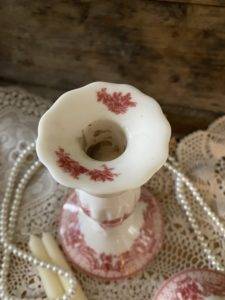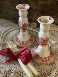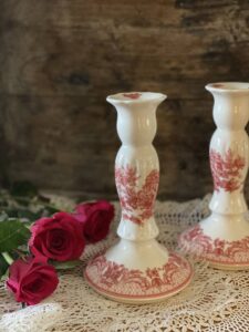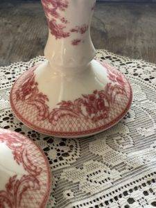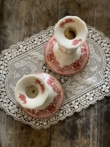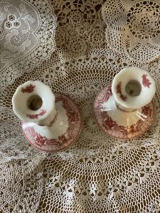 *SOLD* Two incredible vintage candle holders in an attractive red & white transfer ware pattern.