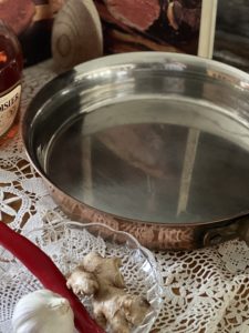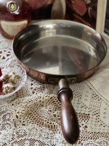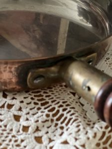 The frying pan is tin lined with a part brass, part wooden handle, giving the pan a rustic charm & a feeling of warmth.