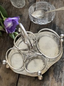 The 4 cut glass pieces sit neatly and safely on a silver plated stand which has 4 ball feet and a round carry handle.