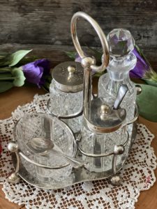 The Set consists of a salt dish, pepper pot , oil/vinegar bottle & a mustard pot. The two spoons are not the original ones so I have included ones that would be suitable for use. ( you could swap the salt and mustard pots over if desired, or use any of the pieces for any use you wished )