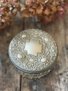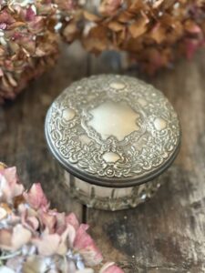 A delightful lidded loose powder dish full of charm, warmth & a lovely sense of history.