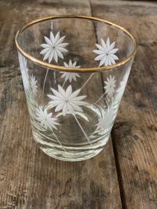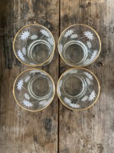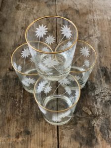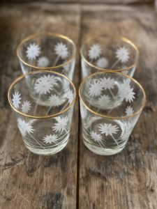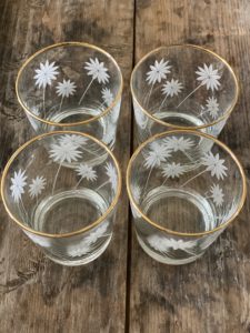 Here we have a very pretty & stylish set of 4 drinking glasses with an elegant white floral pattern etched on the surface, finished beautifully with a gold trim.