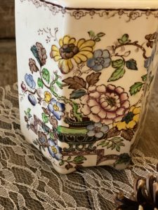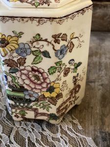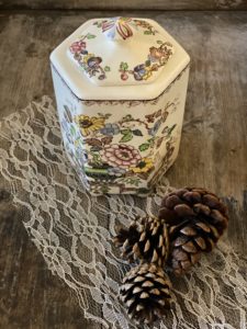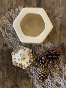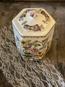 This very stylish lidded storage caddy is in the “Nabob” pattern which is floral & fabulous, is hexagonal shaped & sits on 6 dinky feet.