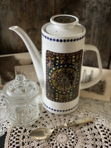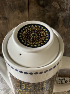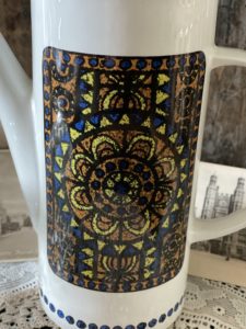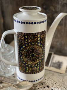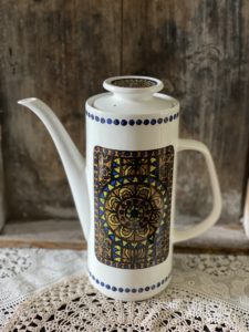 The coffee pot is in the “ Tuscany” pattern which depicts a mosaic style design.