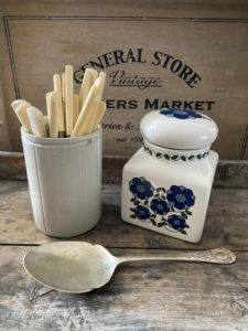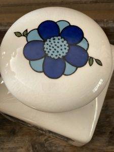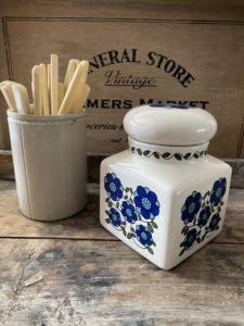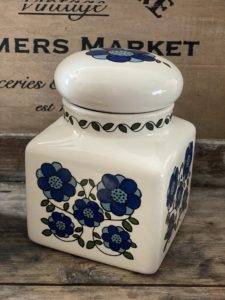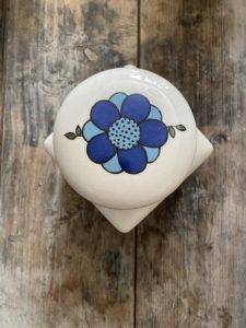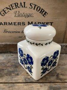 With a white base colour, the jar has a pretty floral daisy print in bright & cheerful blue tones.