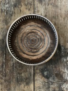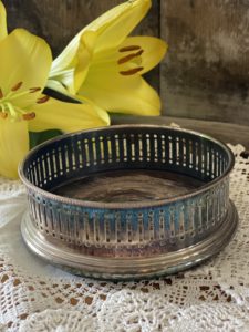 The coaster has a pretty silver plate pierced galleried edging & a delightful turned wooden base. The underside of the base has a protective green felt.