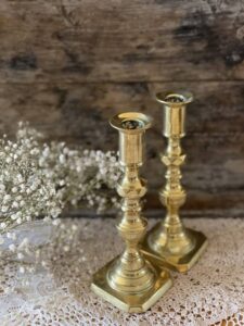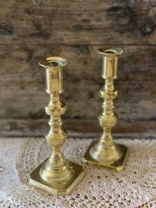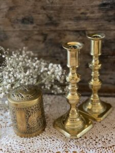 The brass candlestick holders are of a fabulous solid weight & stand proudly at 19 cm in height.