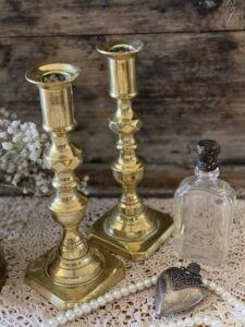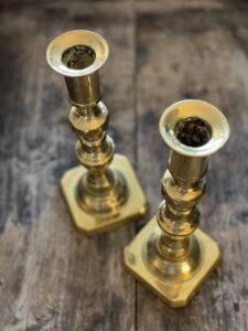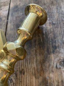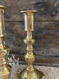 There is evidence of good use over the years mainly inside the holder where there are remaining bits of wax and the expected patina. One of the holders has a dent to the rim which means the top of the holder is not a complete circle shape but rather a little wonky in one area.