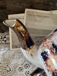 There are a few areas of rubbing to the surface , but the colours are vivid and clean, & the gilt work is still clear to see in all areas. The interior has significant crazing however – its been a busy teapot!