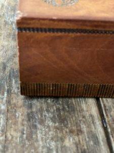 This intricately & beautifully carved wooden box has a hinged lid that is in perfect working order & the bottom of the box’s sides are beautifully marked with ribbed detailing.